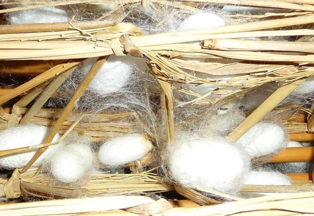 The process of silk production requires seven different functions and begins with the harvesting of the cocoons from the silkworms. This must be done under very high heat so that the worms don’t hatch from the cocoons. Second, the loose end of the cocoon must be identified so it can be unraveled. In some plants, a machine is used to thread it into the eye of the spooling machine; in others, this process is still done by human hands. Each time a cocoon is loaded for untangling, it’s joined to the previous one to create a long, continuous piece of silk thread.